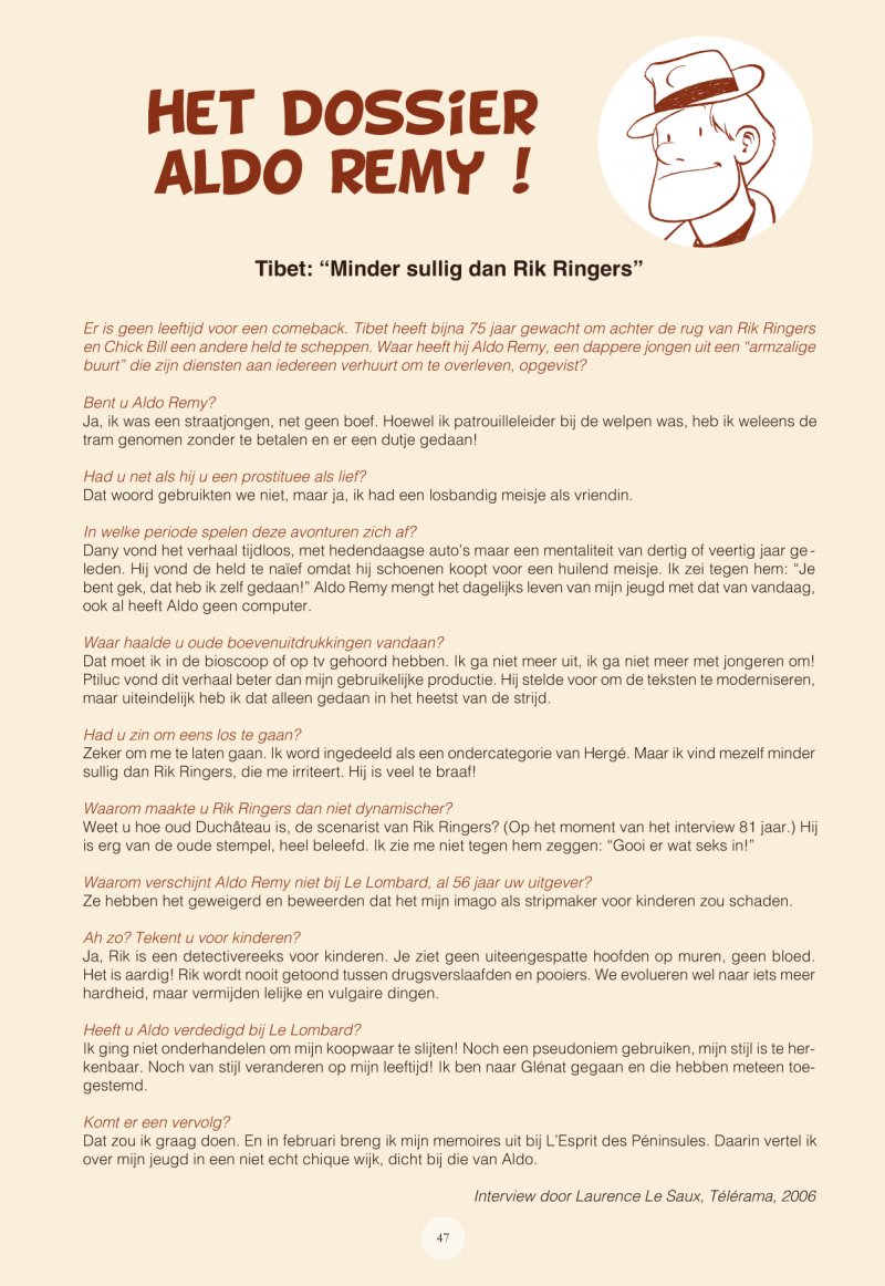 Op 75-jarige leeftijd creëert Tibet — gefrustreerd omdat hij in Rik Ringers niet realistischer, volwassener en gewelddadiger kon zijn — het personage Aldo Remy. Het is zijn meest persoonlijke reeks, en hij put uit zijn eigen jeugd om het personage Aldo Remy, dat hem bijzonder na aan het hart ligt, vorm te geven.